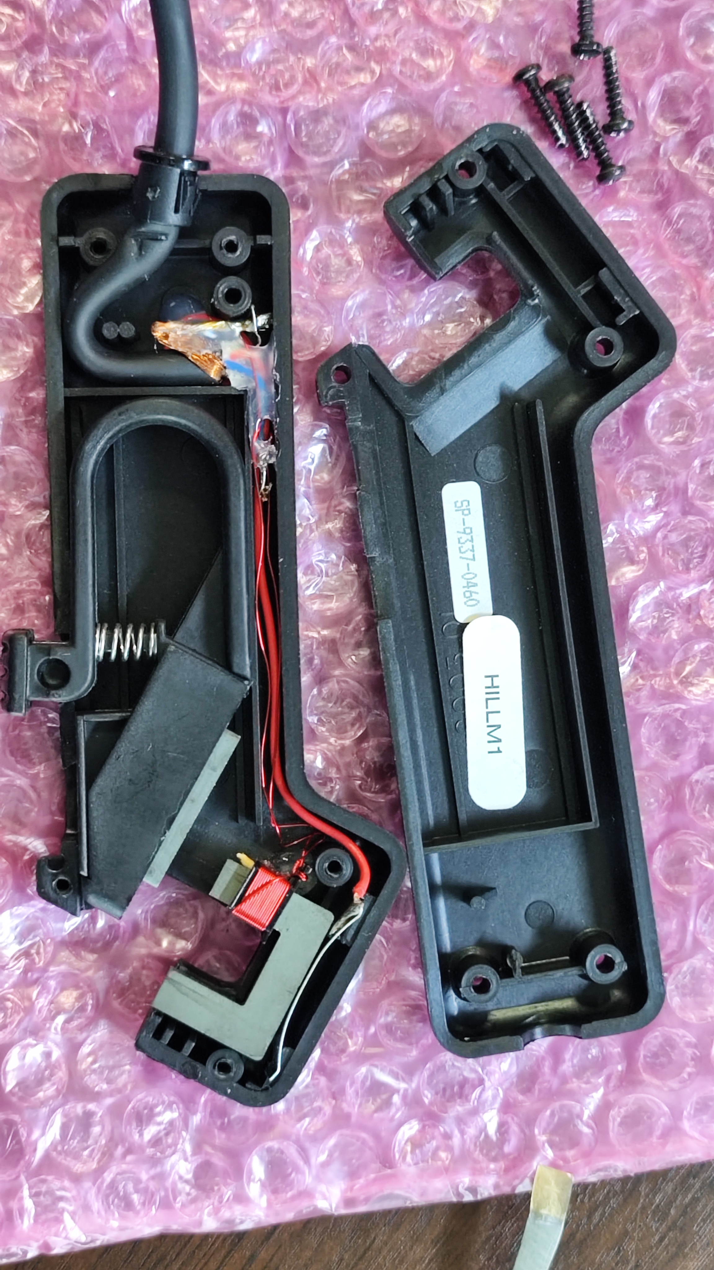 It is equipped with a standard shielded microphone cable (twisted RED+BLUE and SHIELD), but the coil is connected to SHIELD and BLUE wires, RED is connected to the metal clip above the ferrite (some sort of shielding).